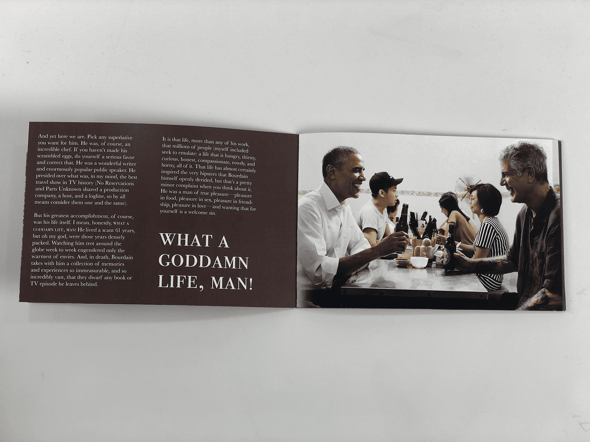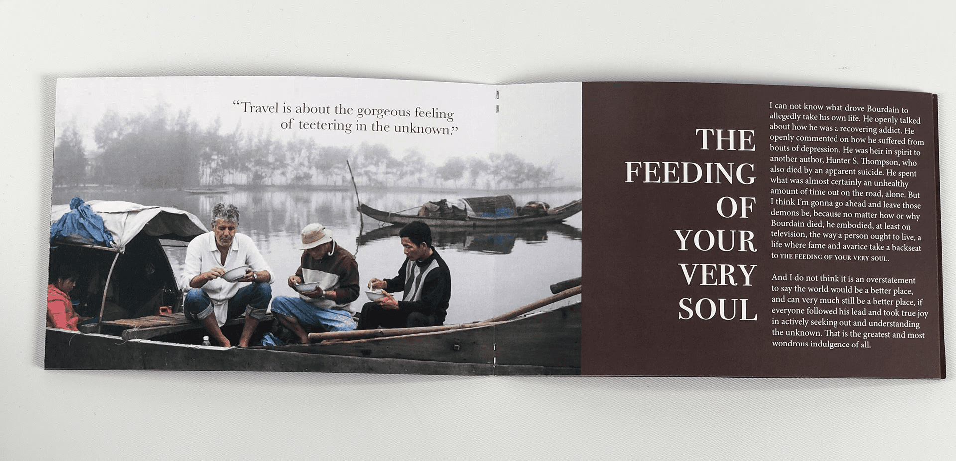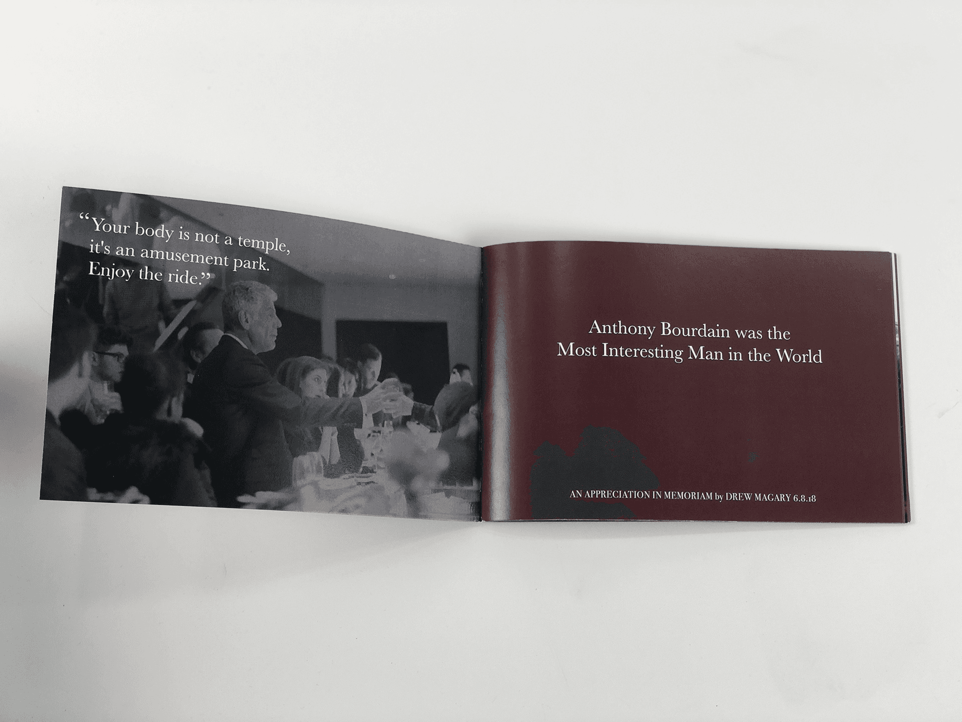 It's claimed that Bourdain was the most interesting man in the world. This design narrative for the exhibition pamphlet was designed to showcase this idea. He was more than a celebrity we knew from TV. He was a writer, a thinker, a traveler, an interviewer, a chef, a father, a son. He hung out with people we will never know. He ate food we will never eat. He went places we will never know. But he shared it all with us. The pamphlet opens and starts with the celebrity version of Anthony Bourdain in a tux proposing a toast with his life's motto above. Over the course of the booklet, we see him with a bit more intimacy. The first spread is again a photo of Bourdain as the celebrity posting for his show's promotional material. The next spread gets a bit more personal; we see him sharing a meal with Obama. This is still very much for the camera during filming for his show but he references this moment often later in various contexts of his life saying that it was a "good meal with a good friend." The next spread is even more personal as we see him enjoying a meal on a boat with a fisherman while he is abroad someplace. Although his moment was still for his show, I believe it represents the moments he spent travelling purely for pleasure. The next spread represents his demons; we see him sitting looking down, shoulder hunched over. He is in a silent contemplate. We will never know what truly led him to take his own life but he still implores us to "raise a glass, cook a pig" and "hug a friend." We see this in the next page; him, with friends, beneath some palm trees near the water, a smile of joy upon his face. Finally, the Anthony Bourdain his friends knew is known to us as well.