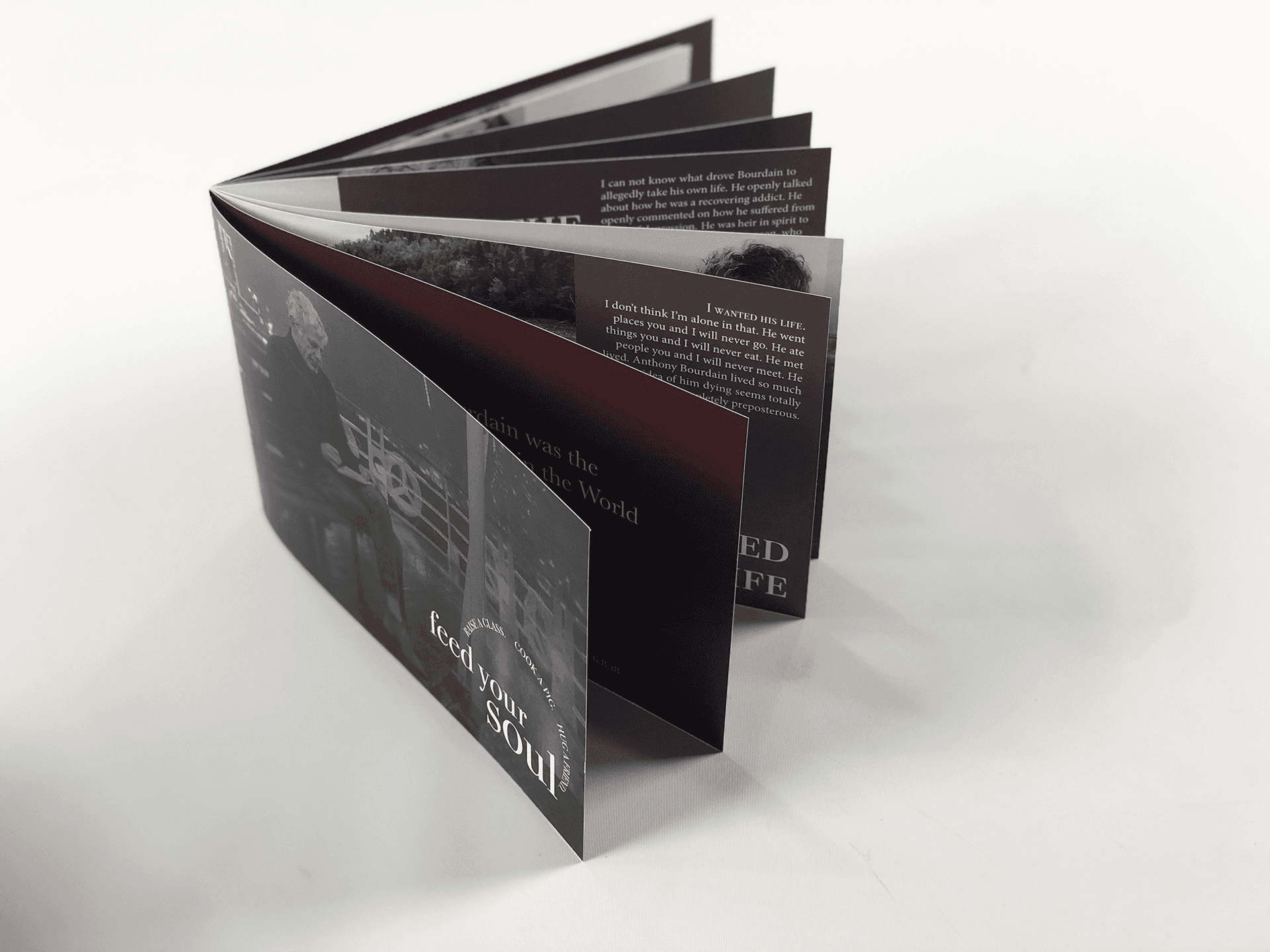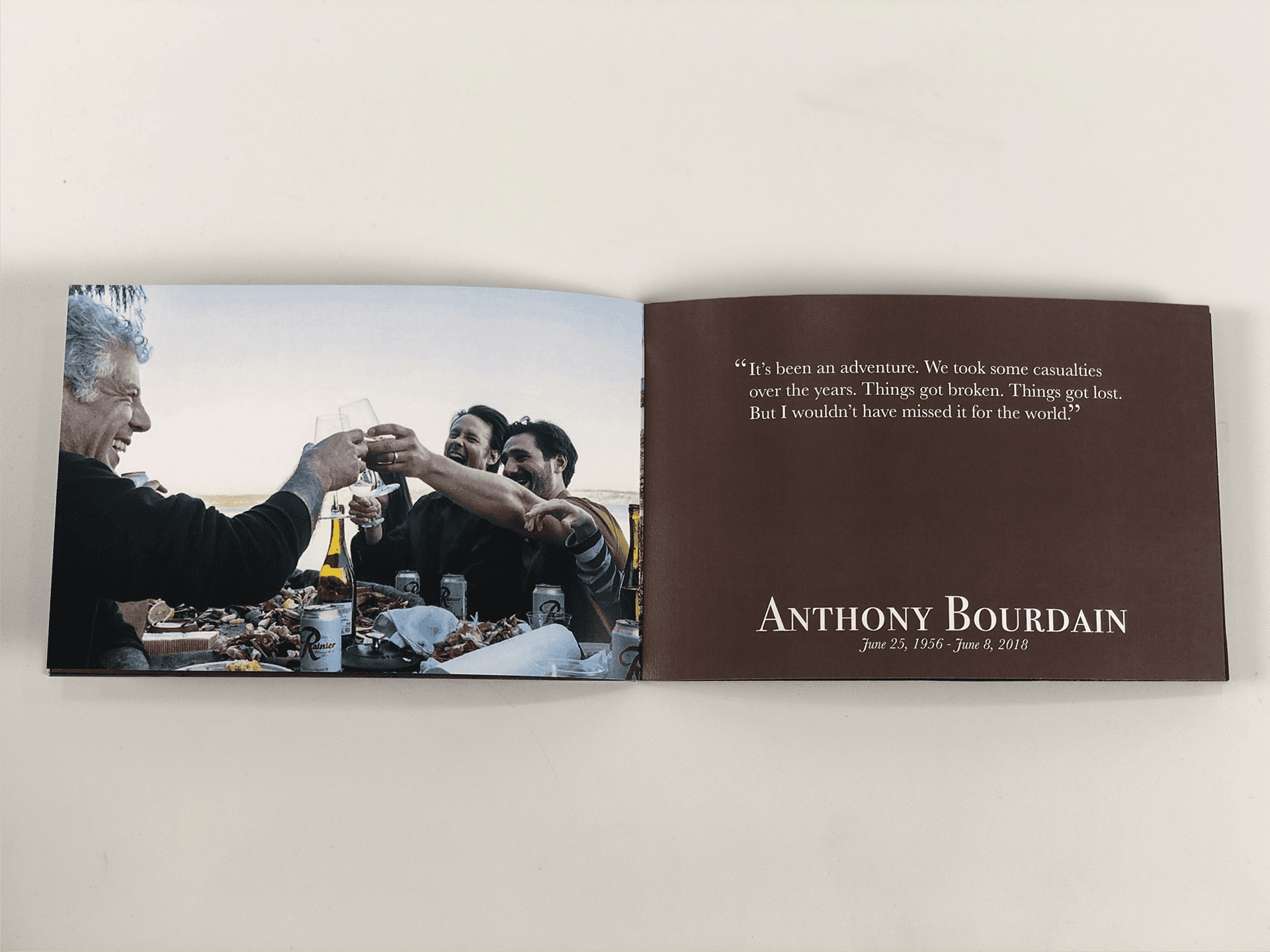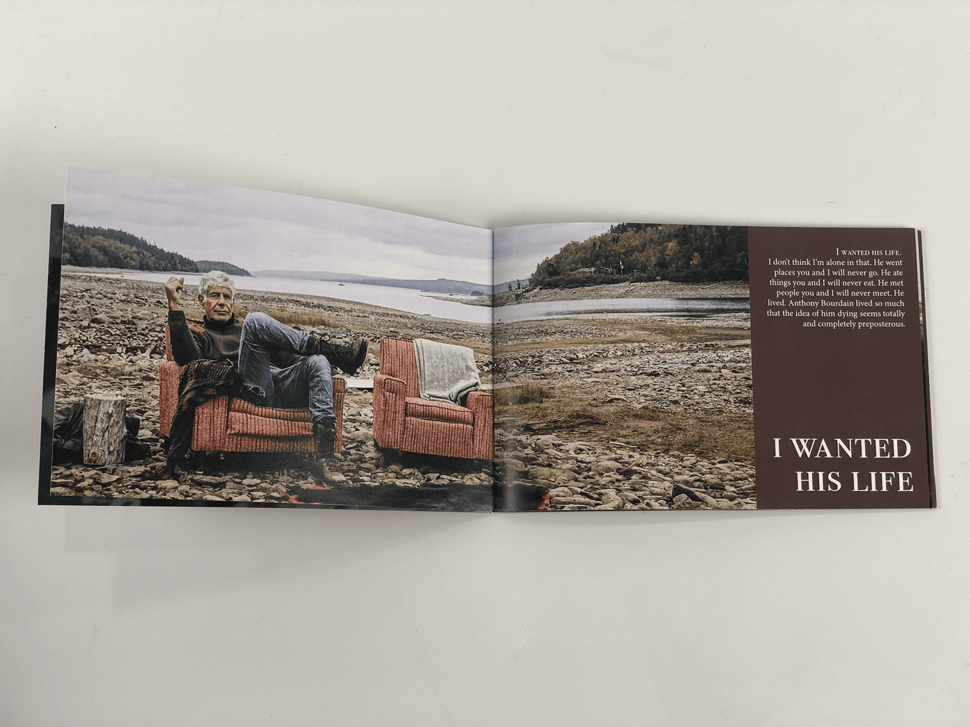 It's claimed that Bourdain was the most interesting man in the world. This design narrative for the exhibition pamphlet was designed to showcase this idea. He was more than a celebrity we knew from TV. He was a writer, a thinker, a traveler, an interviewer, a chef, a father, a son. He hung out with people we will never know. He ate food we will never eat. He went places we will never know. But he shared it all with us. The pamphlet opens and starts with the celebrity version of Anthony Bourdain in a tux proposing a toast with his life's motto above. Over the course of the booklet, we see him with a bit more intimacy. The first spread is again a photo of Bourdain as the celebrity posting for his show's promotional material. The next spread gets a bit more personal; we see him sharing a meal with Obama. This is still very much for the camera during filming for his show but he references this moment often later in various contexts of his life saying that it was a "good meal with a good friend." The next spread is even more personal as we see him enjoying a meal on a boat with a fisherman while he is abroad someplace. Although his moment was still for his show, I believe it represents the moments he spent travelling purely for pleasure. The next spread represents his demons; we see him sitting looking down, shoulder hunched over. He is in a silent contemplate. We will never know what truly led him to take his own life but he still implores us to "raise a glass, cook a pig" and "hug a friend." We see this in the next page; him, with friends, beneath some palm trees near the water, a smile of joy upon his face. Finally, the Anthony Bourdain his friends knew is known to us as well.