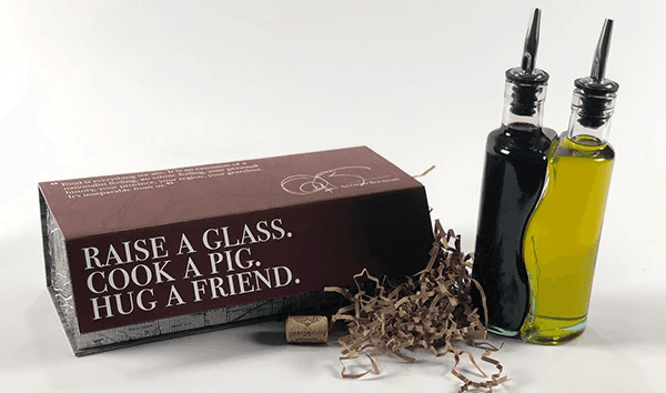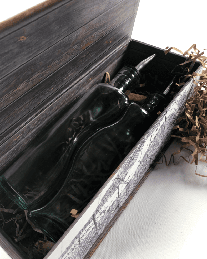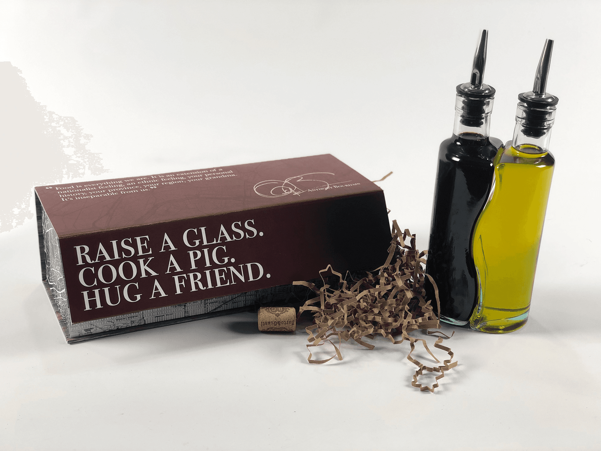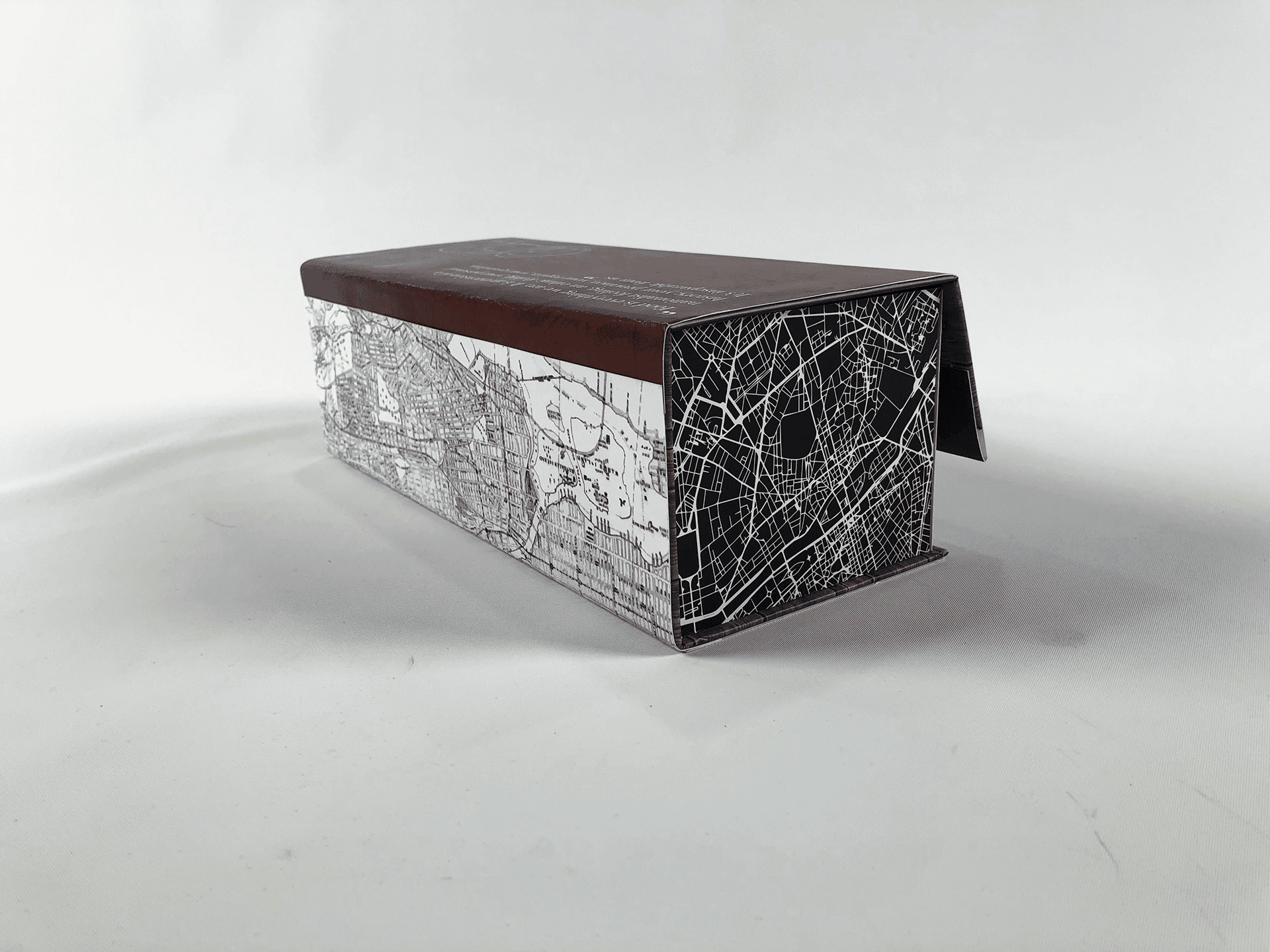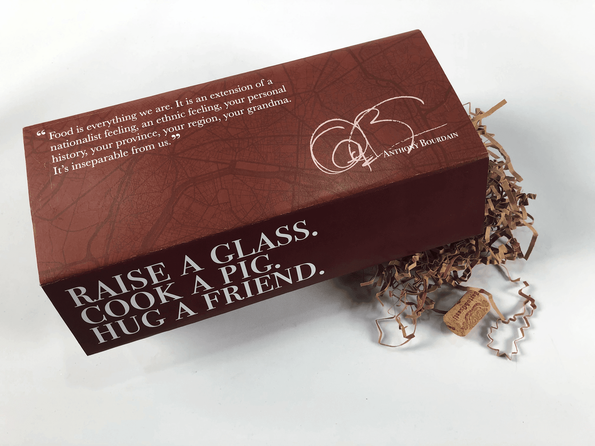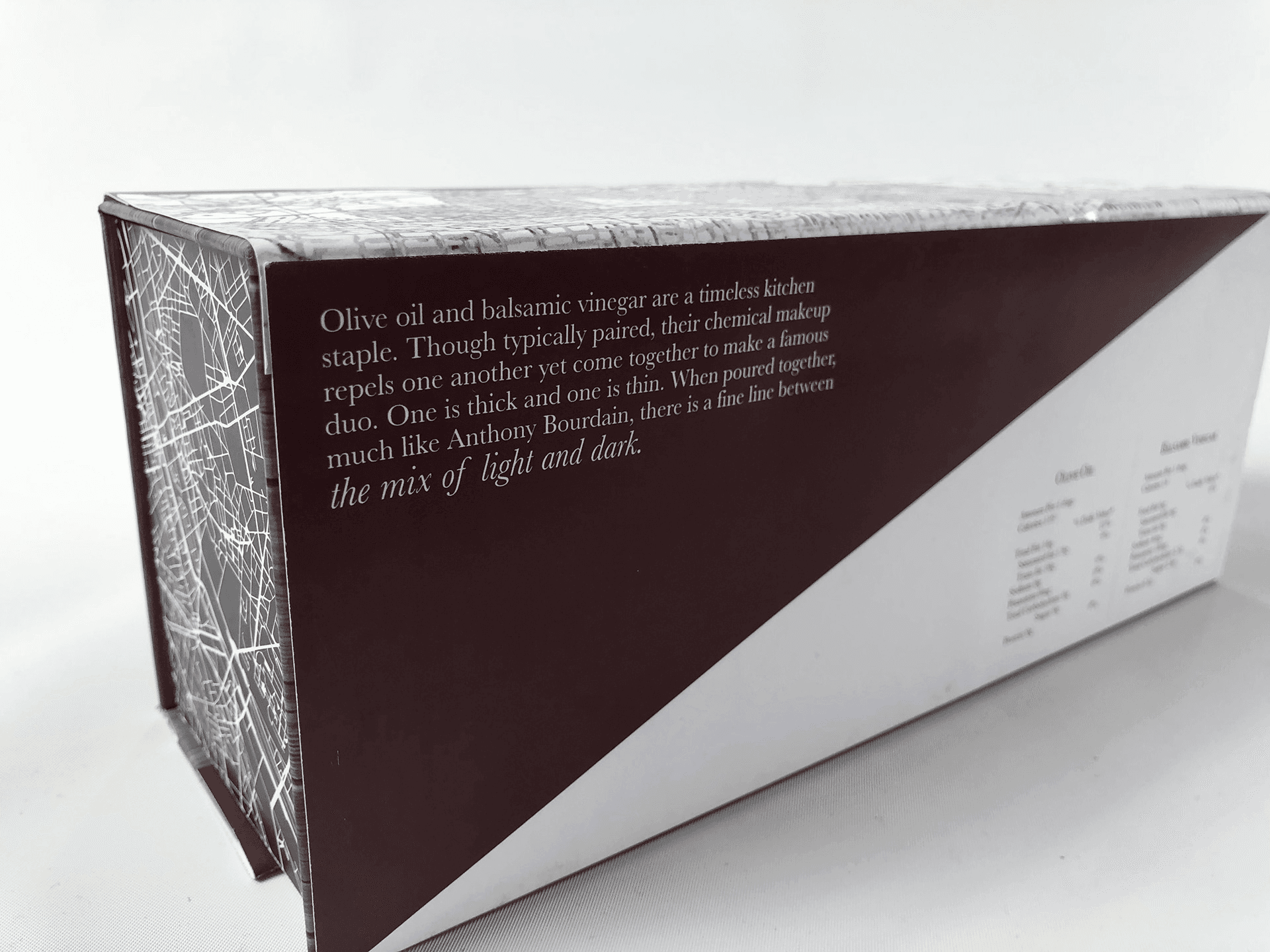 This package was designed in homage to the two most iconic things that Bourdain loved; food and travel. Repeating concepts from before, the square ends of the box are covered in a white on black map of Paris. The middle sides of the box are covered in a black on white map of New York City. On the bottom of the box, there is a line between red and white like the lines that form between olive oil and vinegar when poured together. The text reads "olive oil and balsamic vinegar are a timeless kitchen staple. Though typically paired, their chemical makeup repels one another yet come together to make a famous duo. One is thick and one is thin. When poured together, much like Anthony Bourdain, there is a fine line between the mix of light and dark." The top of the box repeats the visual motif of the map behind a quote from Anthony Bourdain.
