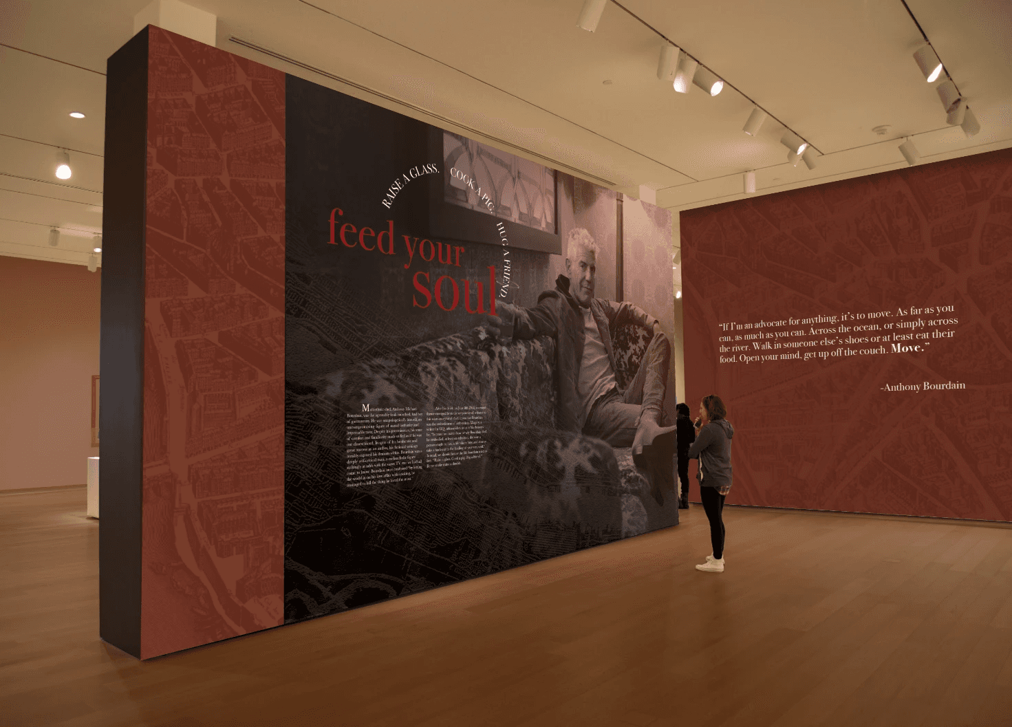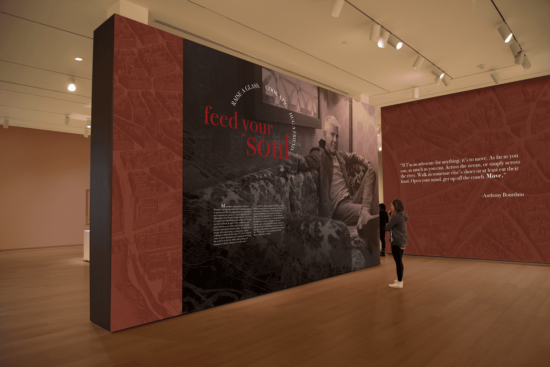 Though a conceptual project, Feed Your Soul remains one of my most personally meaningful works. Designing for someone as layered and beloved as Anthony Bourdain required empathy, restraint, and authenticity. This project taught me how to design not just for visual impact, but for emotional resonance. I hope this exhibit would not only reflect Bourdain’s life, but inspire others to live their own more fully—through food, conversation, and compassion.