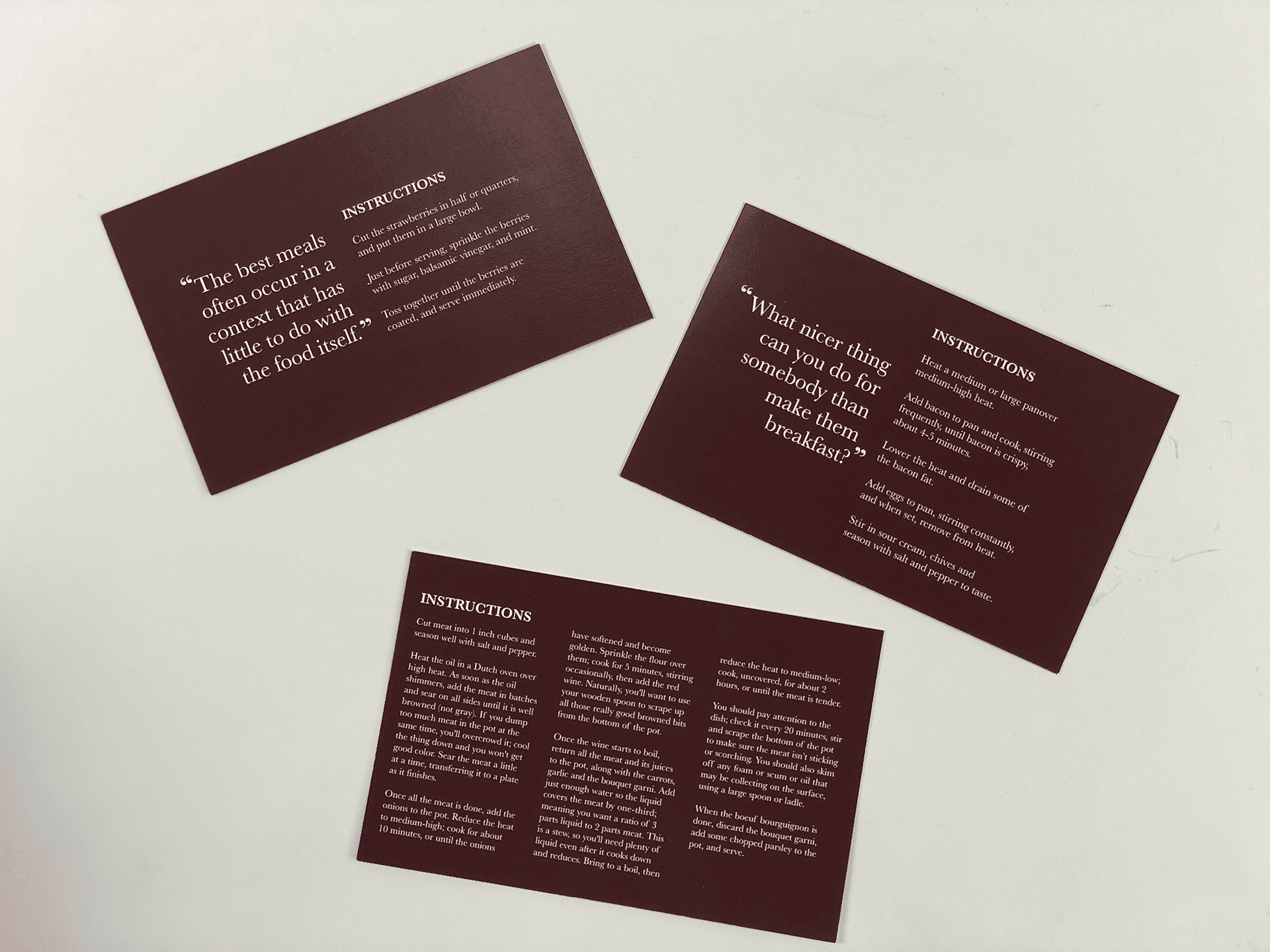 Also included are three recipes at the back of the booklet for readers to take home and try. One recipe is for scrambled eggs. The second calls for olive oil. The third for balsamic vinegar.