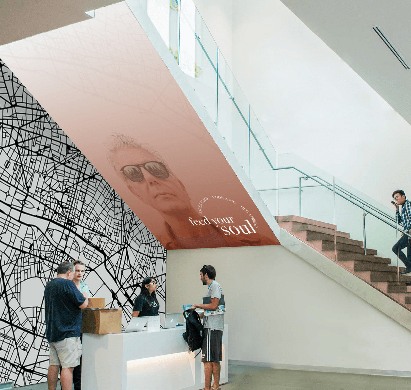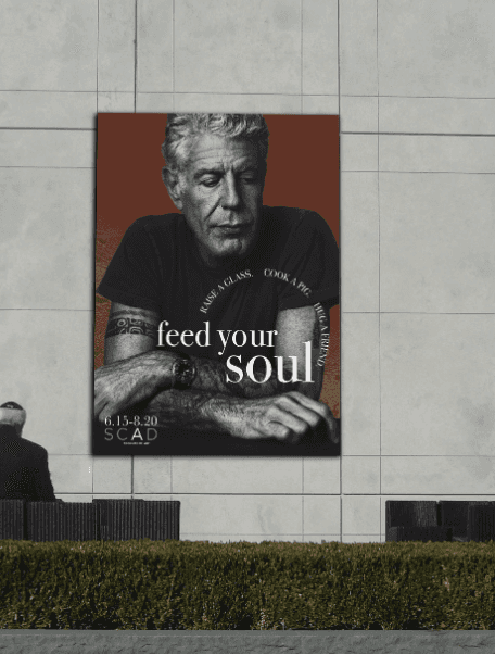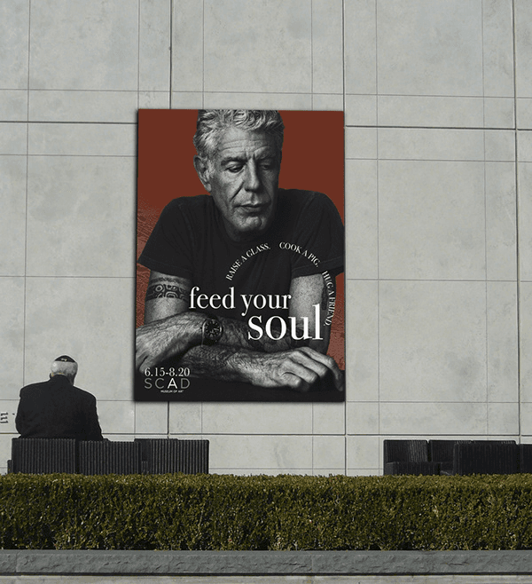 The exterior graphic poster was designed to be impactful, as Bourdain's life was to so many lives. For those unable to travel themselves, he was a vessel to live vicariously through. He was also bold like the color used; the deep red indulgent, the black and white in stark contrast. He was a deeply complex figure and I wanted to convey just a small preview of the man people knew. The viewer sees him sitting, in somber contemplation with a map texture behind him reminding them of the travel he loved. The words "feed your soul" in contrast against his dark shirt and grayscale figure places an emphasis on the positive, savoring lessons he taught us while himself absorbed by darkness.