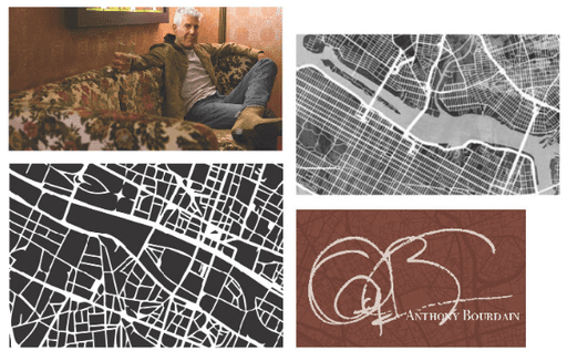 These graphic elements are made up of Bourdain himself, his signature, and maps of both New York where he lived and worked, and Paris where he fell in love with food and ultimately ended his life.